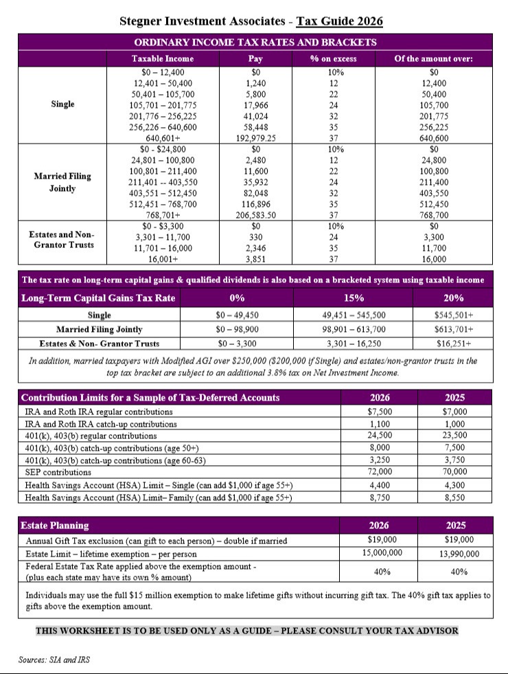 Please take time to consider 2026's tax changes for future plans for your investments. This information should only serve as a guide, so please seek more specific advice from your accounting, estate planning and insurance professionals.