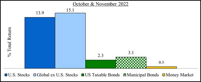 The chart above indicates a rally in both stock and bond benchmarks since the end of the third quarter. This rebound occurred despite the grim outlook for global growth and rising inflation.